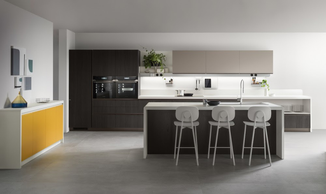 Nella foto la cucina connessa Dandy Plus di Scavolini, design Fabio Novembre, dalle linee curve abbinate a texture decorative e vivaci colori, è caratterizzata dall'elemento a ponte che fa da cornice alle basi dell’isola e del buffet definendone il profilo e rendendo il suo aspetto uniforme. Le ante delle basi sono in impiallacciato Rovere Carbone e laccato opaco Giallo Senape quelle dei pensili in decorativo Grigio Selce. Il tocco di colore è dato dal Bronzo che caratterizza le maniglie. La Task Bar, la barra attrezzata in alluminio fissata alla parete sotto i pensili ospita Alexa, il dispositivo altoparlante intelligente che controlla gli impianti tecnologici attraverso BTicino Living Now ed è completata dagli slot rotondi incorniciati da anelli in plastica riciclata che ospitano prese elettriche, porte USB, mensole, accessori e contenitori, tutti caratterizzati da accenti di colore coordinati.