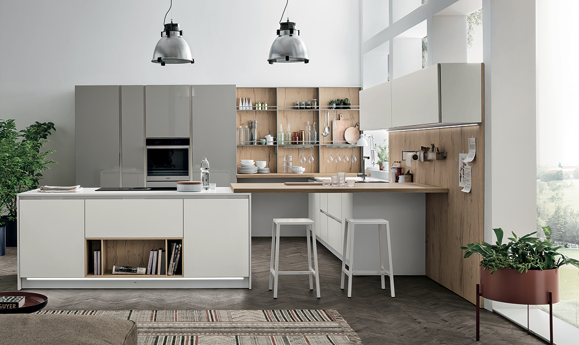 Alevè, con basi e pensili in Laccato UV Neve opaco, colonne Laccato UV Malta lucido, vani a giorno, boiserie e piano Snack in Rovere Natura [Stosa]. Doppia profondità per l’isola: la parte in cui ci sono i fuochi