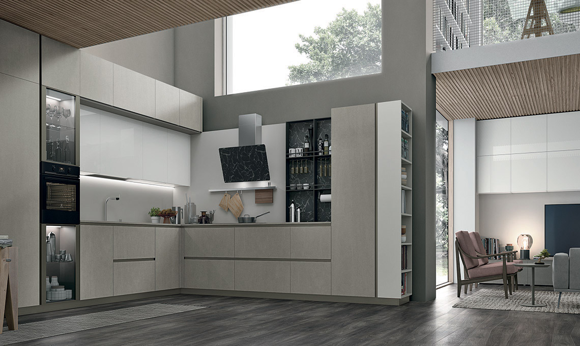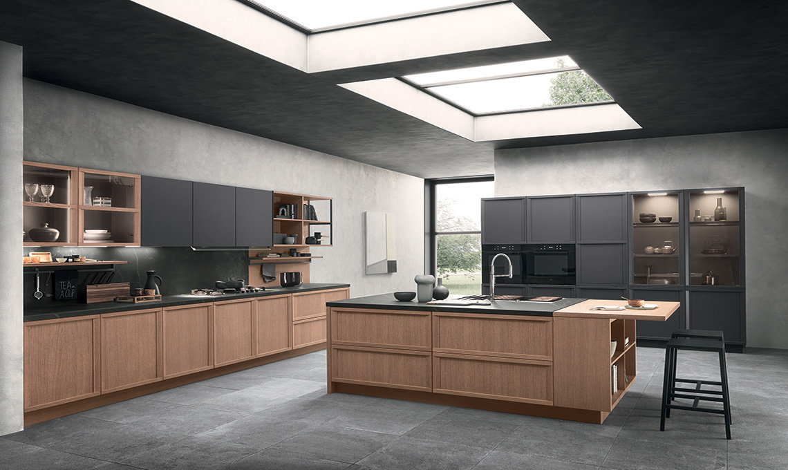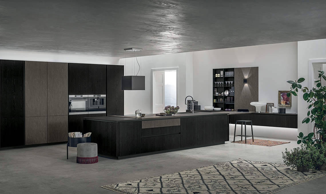 La cucina Natural cambia look e si presenta con anta liscia in 3 nuovi colori: l’essenzialità del Bianco, il carattere del Nero e il calore del Cherry si aggiungono alle altre tonalità del Rovere. Natural esprime tutta l’autenticità del legno vero in otto nuance selezionate per dare naturalezza alla modernità. Le colonne vengono proposte con un’altezza di 234 cm con capienza maggiorata. Natural si apre a un nuovo progetto di composizione lineare: due livelli di pensili aggiungono contenimento, sfruttano lo spazio in altezza e giocano con i volumi attraverso diverse profondità e nuove finiture. Qui le finiture delle ante: Rovere Nero liscio e HPL Testa di Moro, top in HPL Testa di Moro e Fenix Cacao Orinoco, maniglia, gola e zoccolo in Nero spazzolato.