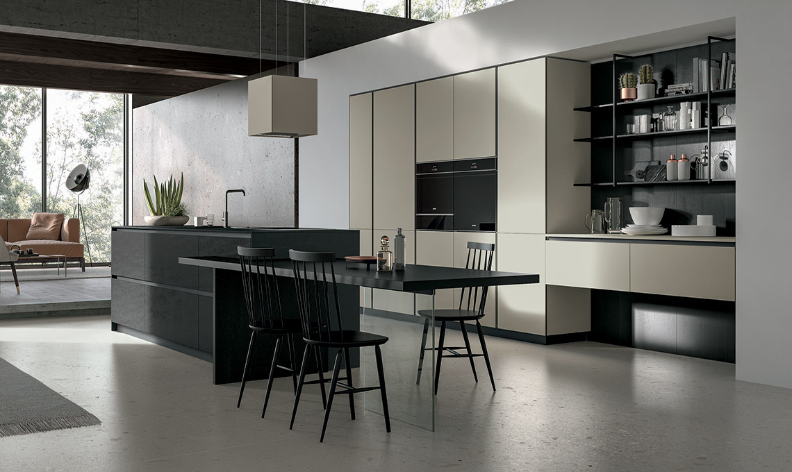 Questa versione della cucina Aliant è progettata con la modularità di Evolution System che introduce un’aumentata capacità di basi, cassettoni, colonne e pensili, doppi ripiani all’interno delle basi, top a filo anta e interni preziosi. Lo zoccolo di 8 cm e le gole nelle finiture Nero spazzolato o Titanio disegnano i volumi, donando alle composizioni un rigore geometrico, sottolineato dalla pulizia delle forme. Ante in Neolith Cement Satin e vetro Frost lucido, top in Neolith Cement Satin, maniglia o gola w zoccolo Titanio