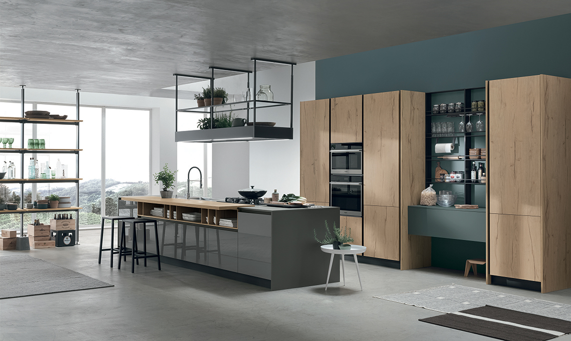 Infinity è una cucina versatile che propone uno spazio dinamico e creativo in cui tutto è possibile a metà tra nordico e metropolitano, abbinamenti e finiture che vanno dalle venature tipiche del legno a materiali tecnologici come Fenix ed eco-sostenibili come il PET. Qui le ante delle colonne e il piano snack sono in termostrutturato Rovere natura, le basi sono in Pet grau lucido, la base sospesa e lo schienale sono in Fenix Verde Comodoro; top in Fenix Piombo Doha e zoccolo Nero Spazzolato. La libreria a giorno Combo Line inserita tra le colonne ha elementi in alluminio attrezzabili con accessori porta mestoli o porta calici. La naturalezza del Rovere rende bella l’estetica della cucina, ma anche la sua funzionalità: i ripiani del divisorio Combo line, il piano snack dell’isola, i moduli a giorno sempre dell’isola e le colonne multifunzionali. Con il Pet lucido, il Fenix del top e il metallo della struttura del divisorio, la versione più naturale del Rovere si esprime in tutta la sua modernità, grazie all’abbinamento con altri materiali.
