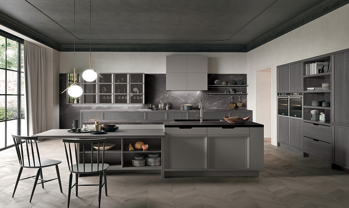 Il design essenziale della cucina Newport consente al legno, materiale nobile per eccellenza, di trovare la sua espressione contemporanea. I particolari di impronta classica, come l’anta a telaio o le ampie vetrine, si inseriscono in una cucina caratterizzata da una linearità molto netta che rende il modello estremamente versatile e inseribile in contesti sia metropolitani che tradizionali. Qui ha colonne e basi a cestoni con anta a telaio in Frassino Grigio Pernice, vani a giorno e mensole in Frassino Grigio Pernice, top Iris in finitura Pietra Grey levigato, pensili a vetro con anta a telaio in Frassino Grigio Pernice, pensili cappa laccati Grigio Piacenza come l’isola centrale. Zoccolo: impiallacciato Grigio Pernice (composizione) e laccato Grigio Piacenza opaco (isola).