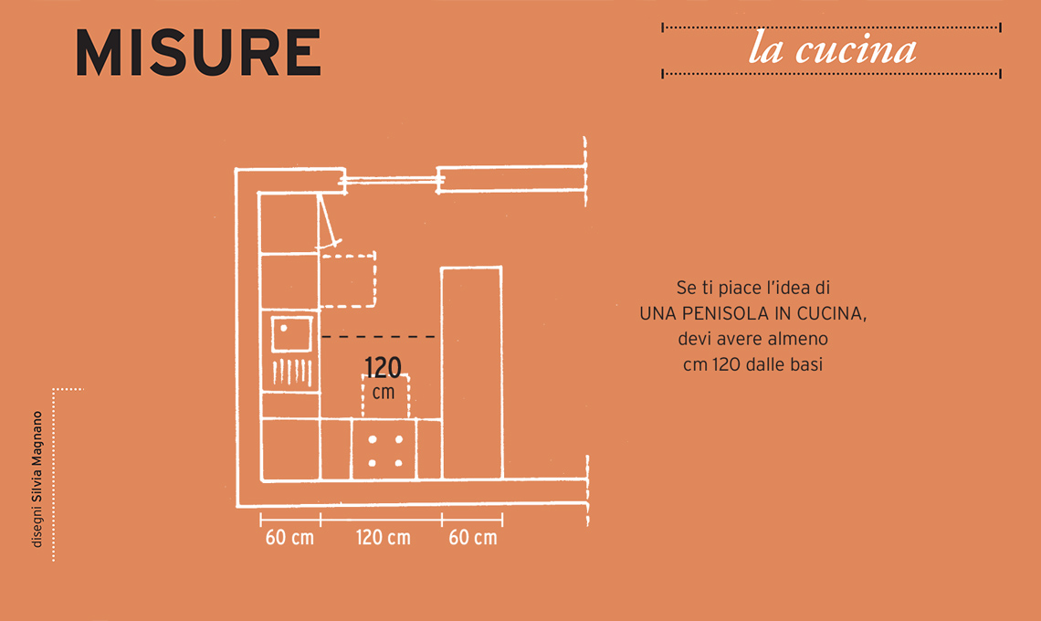 Vuoi inserire una penisola? Deve essere distante almeno 120 cm dalle basi operative (dove hai fuochi, lavandino e elettrodomestici).
