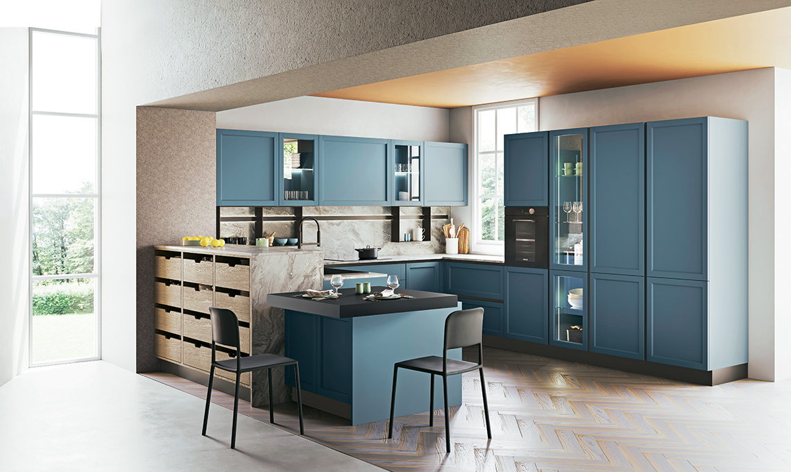 Se desideri un’ampia zona operativa è meglio avere l’isola con fuochi e lavello (minimo cm 90x 240), più un banco snack e una parete a colonne per il contenimento. Per aprire ante e cassetti, tra colonne e isola servono cm 120, tra isola e tavolo cm 90 e tra questo e il sofà cm 70.