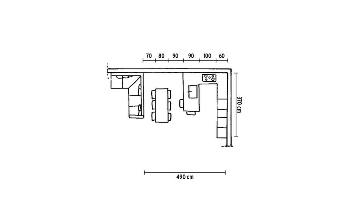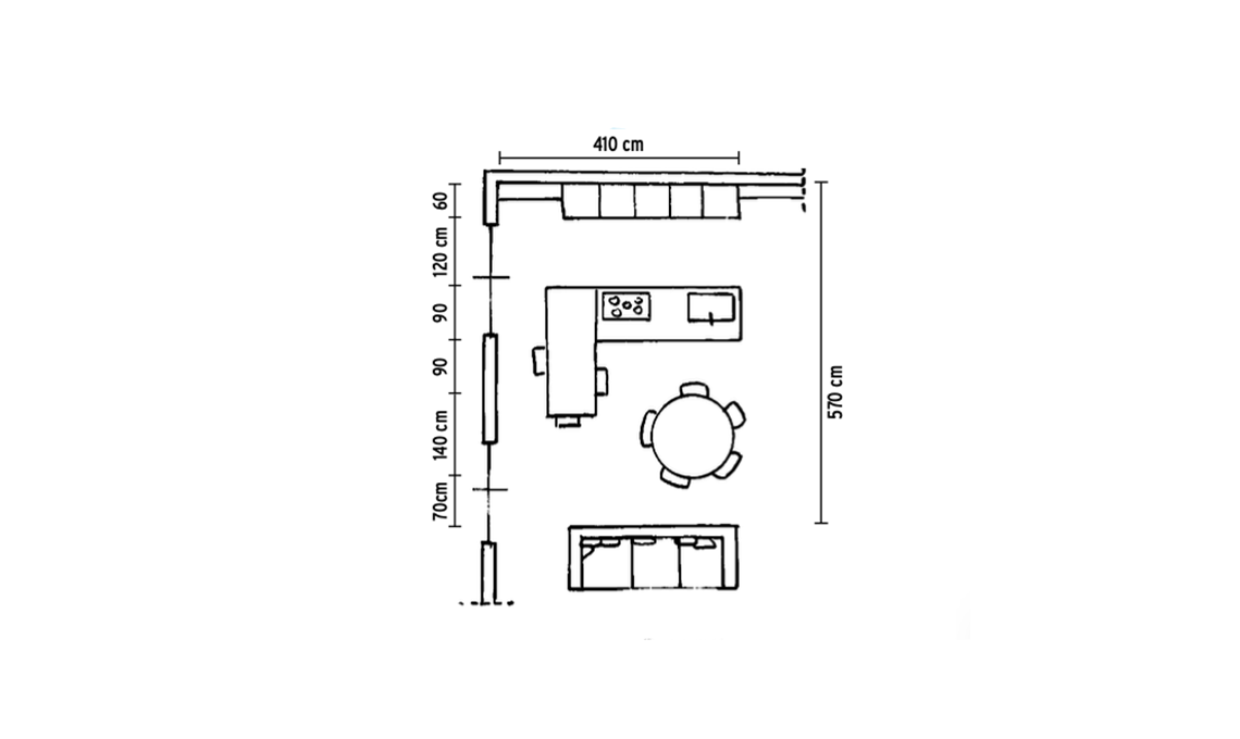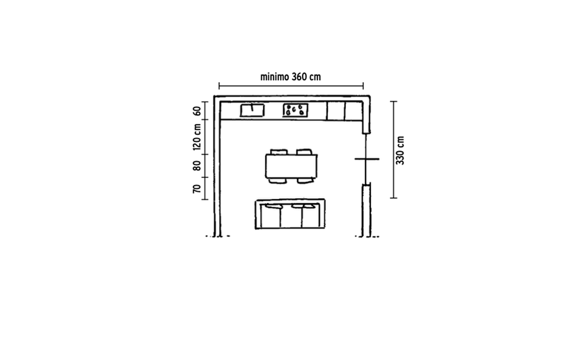 Risulta ergonomica, con un piano di 40 cm ai lati di lavello e fuochi, se ha una lunghezza minima di cm 240 più le colonne, per un totale di cm 360. Tra basi e tavolo servono cm 120 e tra tavolo e divano cm 70.