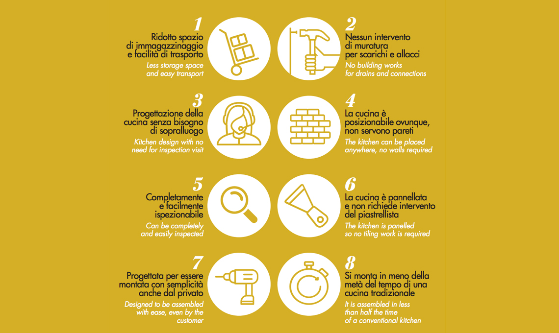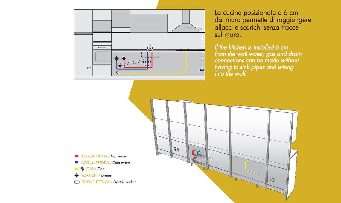 Nelle case in affitto non sempre è possibile effettuare lavori, soprattutto in bagni e cucine dove occorre intervenire sugli attacchi di acqua e gas. Per questo, Moretti&C.2 con StandApp ha realizzato una cucina che si fissa a una struttura autoportante (da accostare alle pareti esistenti ma anche da installare a centro stanza), all’interno della quale passano tutti gli impianti.
