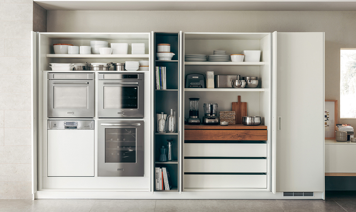 L’armadio tecnologico che ospita 2 forni, cantinetta e lavastoviglie: chiudi le ante e loro scompaiono ai lati di ogni modulo, all’interno di un’apposita intercapedine ricavata nelle spalle.