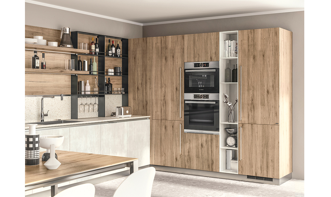 Tutto a vista con il sistema Setup (spessore cm 13) in metallo, i cui ripiani hanno la barra anticaduta per barattoli, bottiglie e bicchieri... e c’è anche il portacalici. Nel modello LiberaMente.
