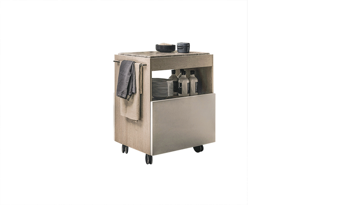 Carrello con struttura in Decorativo Rovere Gessato, tagliere, piano d’appoggio e cestone estraibile con anta in Argilla Lima. [Modello Mia by Carlo Cracco].