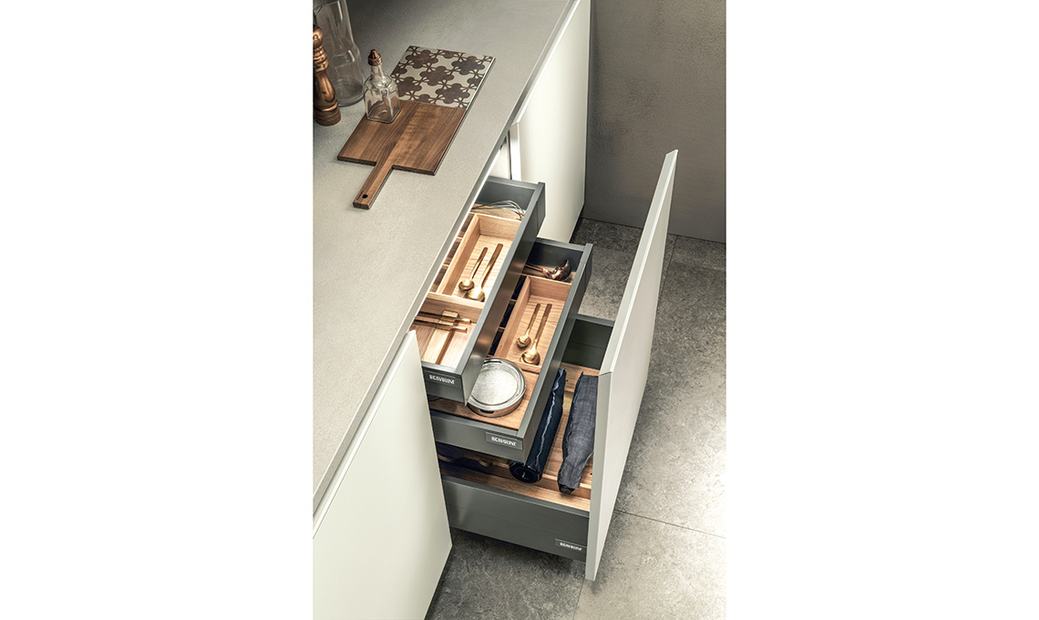 Oggi i produttori ci vengono incontro proponendo ottime soluzioni, come le boiserie con ripiani da fissare all’altezza desiderata e da attrezzare con gli accessori più svariati, e i divisori per l’interno dei cassetti per avere in ordine posate, utensili, piatti e pentole. Geniali, poi, i moduli scorrevoli sottopiano: sfruttano la profondità per bottiglie e barattoli e integrano tagliere e coltelli o anche il bidoncino dell’umido!