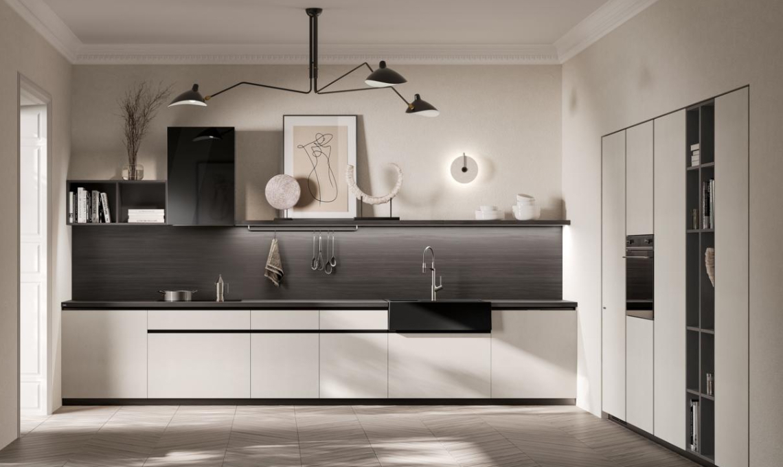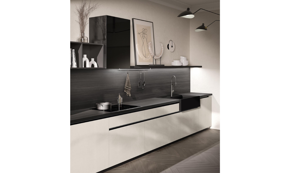 Questa cucina è Mira di Scavolini, in una composizione lineare con ante in decorativo Home Matter più elementi a giorno in decorativo Gate Matter, piano cucina e alzata in Laminato Burnt Wood (spessore 4 cm), lavello a monoblocco Contempo in materiale sintetico anti- batterico su base alta 60 cm.