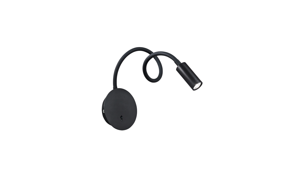 Focus ha il diffusore fissato a un braccio flessibile orientabile rivestito in gomma, tutto in finitura nero opaco [Ideal Lux, ø cm 8,5x55].