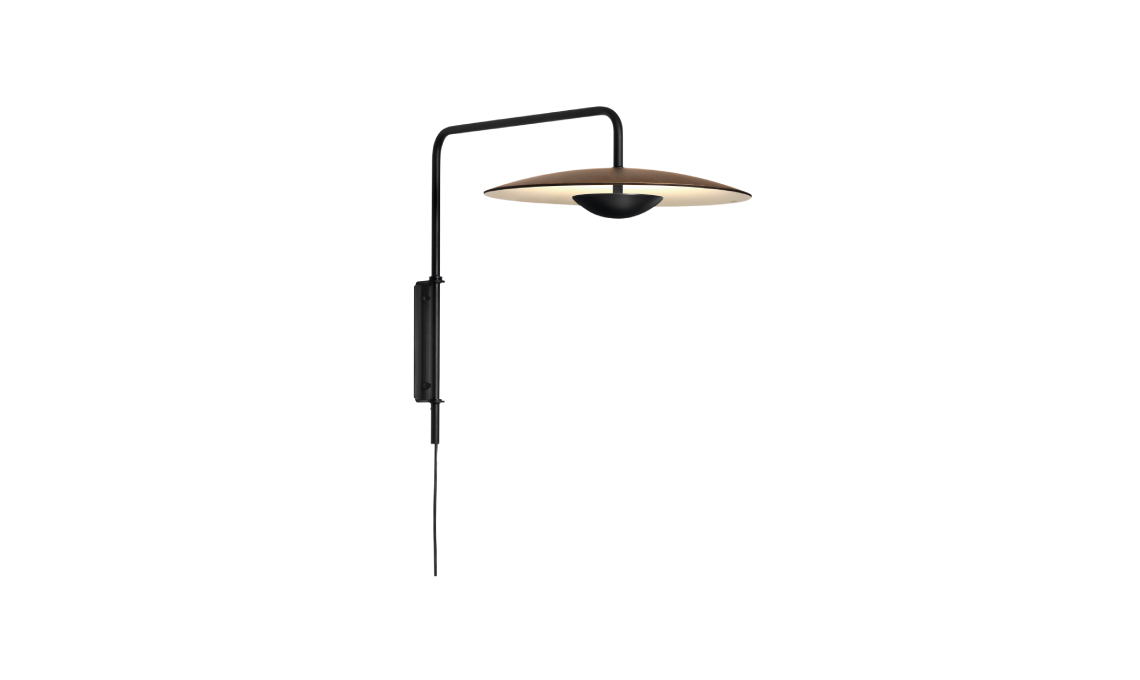 Ginger, dal paralume in legno e smalto bianco ha il braccio girevole in metallo nero [Marset, cm 19,5x38,9x21,7h].