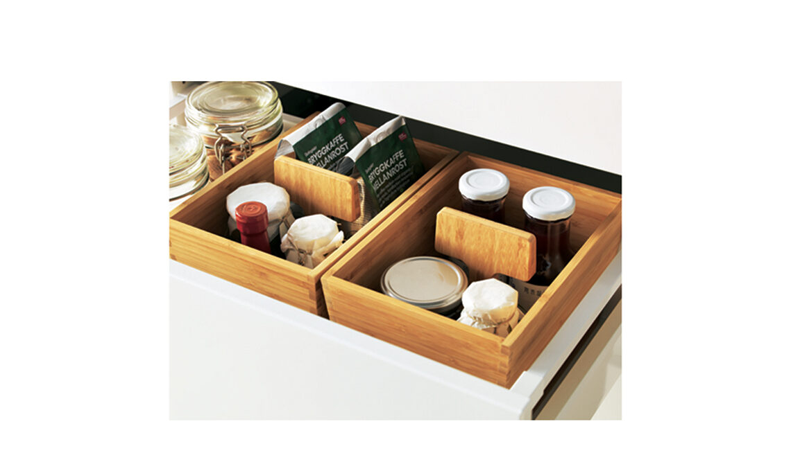 Cesti in legno Variera, utili per dividere i cassetti e dotati di manico, per essere portati in tavola [Ikea].