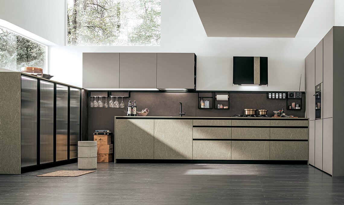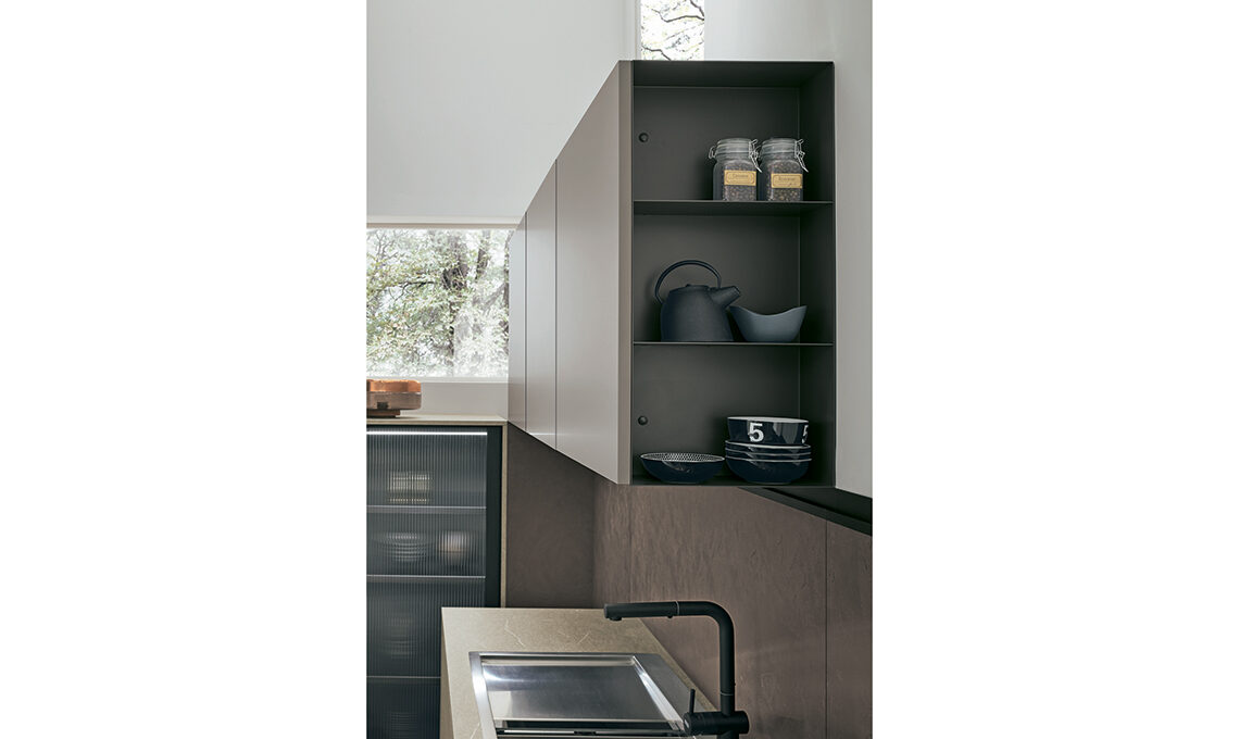 Cucina Metropolis 75 di Stosa con colonne midi con ante telaio e vetro cannettato, top e fianco in Pietra Piasentina; basi, colonne e pensili Cleaf Piasentina Scura, Cemento Vulcano, Pet Gri- gio Freddo; schiena Sistema Base con pensile Joy, nero con Piasen- tina scura. Cappa Cannetè nera con inserti in Piasentina scura.