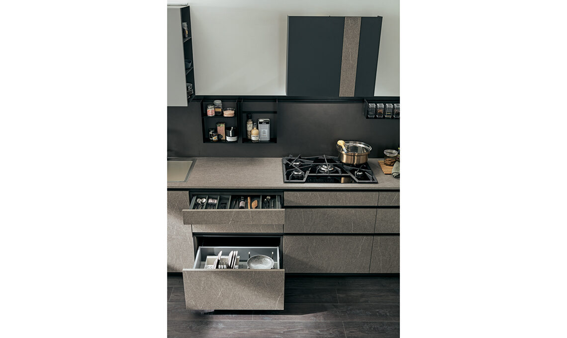 La soluzione è scegliere una cucina che, con piccoli ma fondamentali accorgimenti, riesce ad aumentare lo spazio contenitivo a parità di volume. Come con la cucina Metropolis 75 di Stosa che grazie a Evolution System ha zoccolo di 8 cm, altezza delle basi di 81 cm e pensili più alti e profondi per un contenimento maggiore; e le scocche si allargano a 75 cm anche per le colonne, per ospitare gli apparecchi di nuova generazione.
