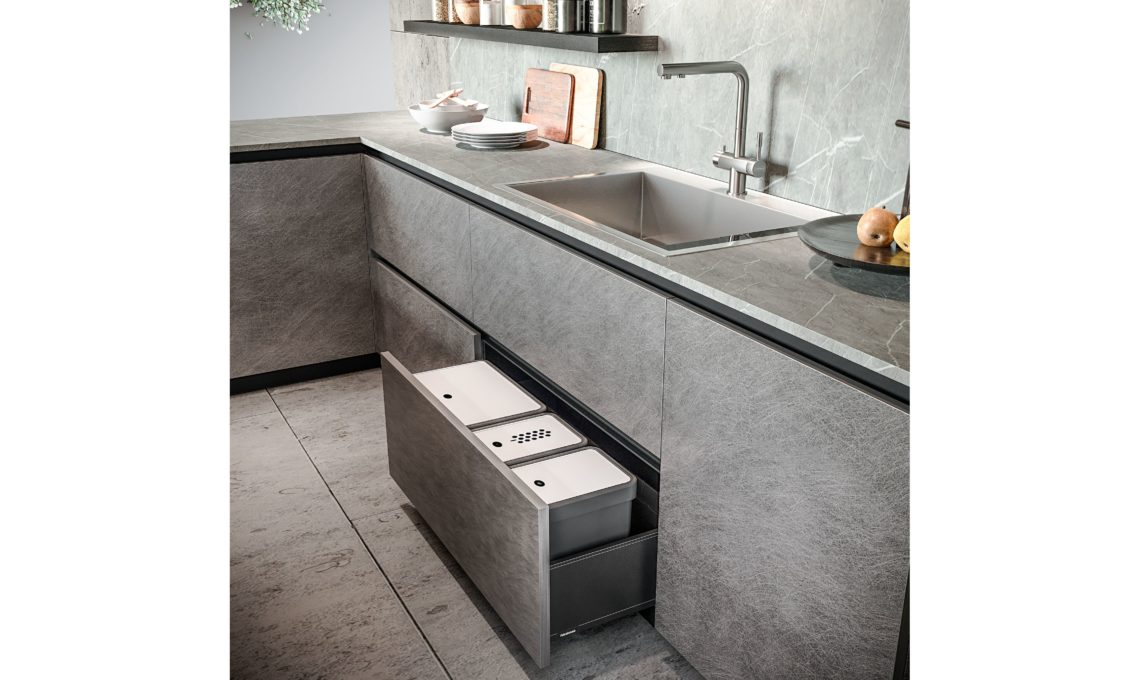 Superpratici i piani rotanti estraibili: sfruttano tutto lo spazio e consentono l’accesso totale al contenuto dei moduli angolari. Gole e zoccolini corrono in orizzontale lungo tutte le basi, creando un effetto sbalzo per ante e top.