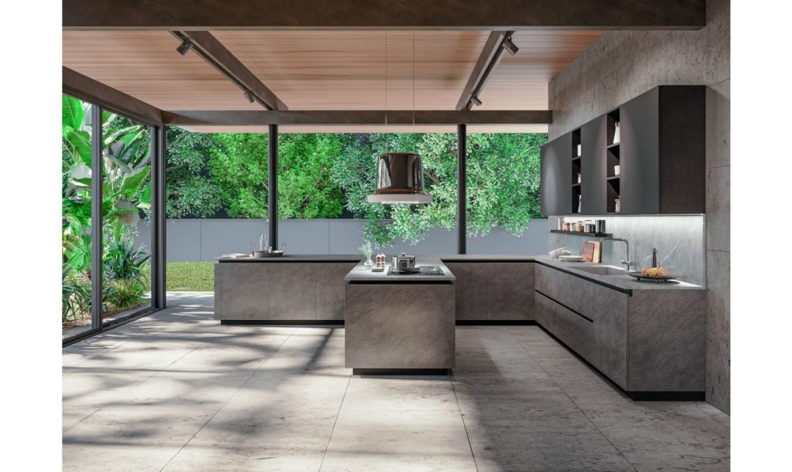 Questa cucina è: Ego Line di Febal Casa con ante laccate Metal Skin Peltro Stagno, top in grès Zaha stone silk e gola in laccato opaco grigio antracite; vani a giorno Daily22, alternati a pensili chiusi a battente, entrambi nella finitura laccata grigio antracite. Supertecnologica la cappa Glow Plus [Faber] che si connette al piano cottura a induzione.