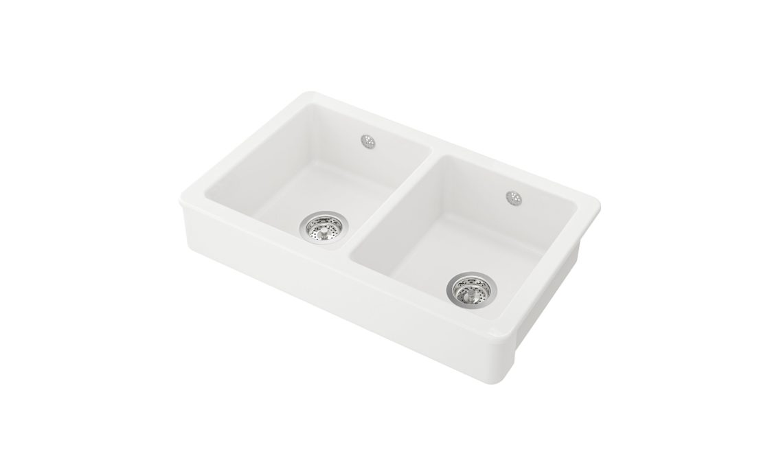 In ceramica: Havsen a due vasche si appoggia come i lavabi da semincasso; il miscelatore va a parete o sul top [Ikea, cm 82x48].