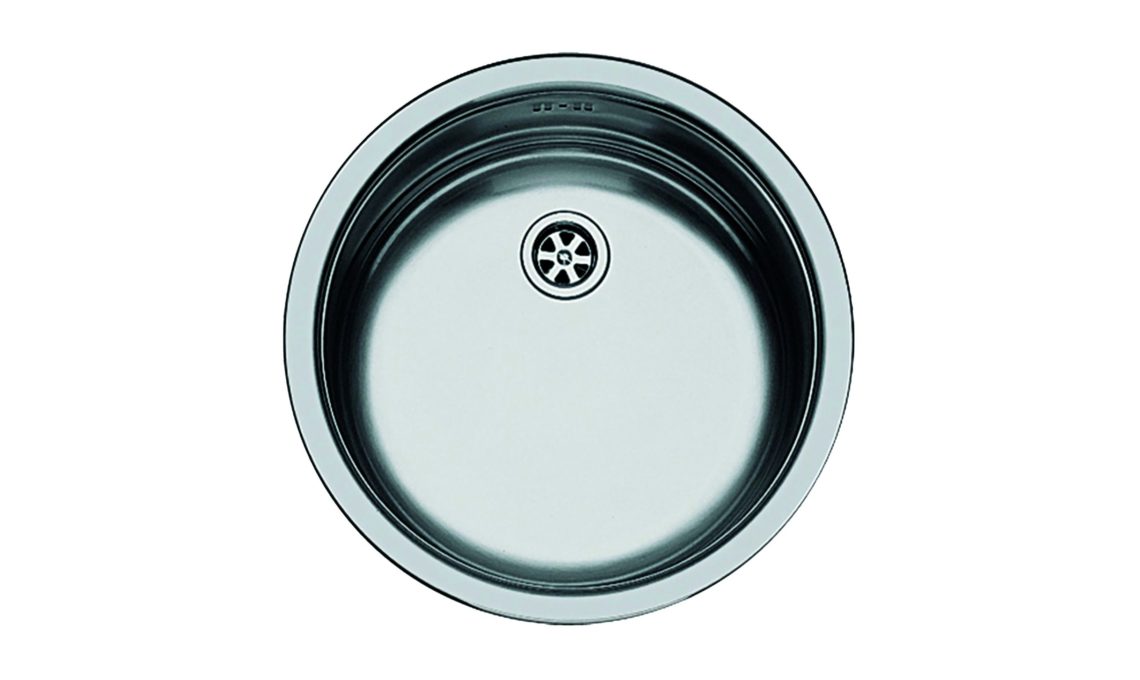 In acciaio: con finitura spazzolata, ha vasca tonda e si incassa sul piano singolarmente o a coppie [OBI, ø cm 44].