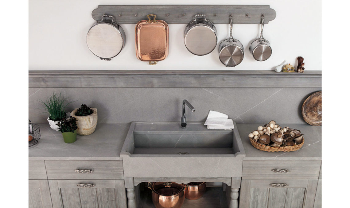 In pietra: ideale per le cucine rétro, ma perfetta anche per quelle contemporanee, la maxi monovasca in pietra piasentina [Scandola, cm 90x60].