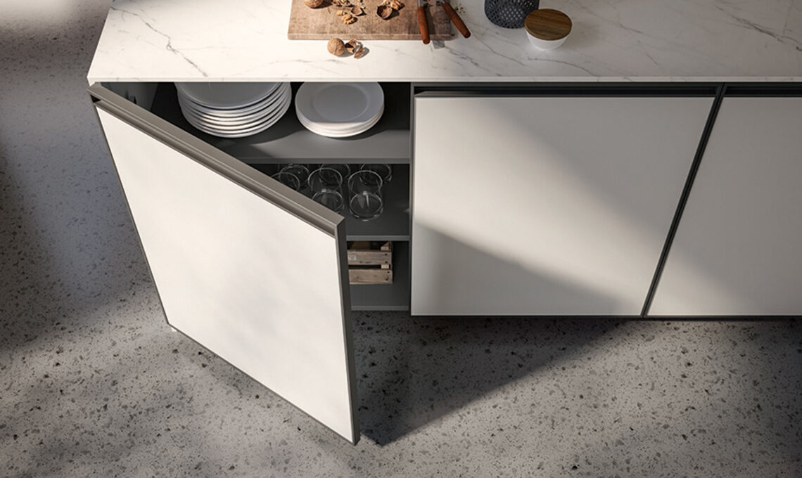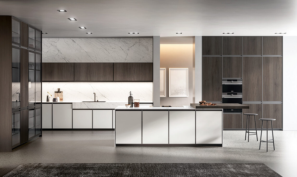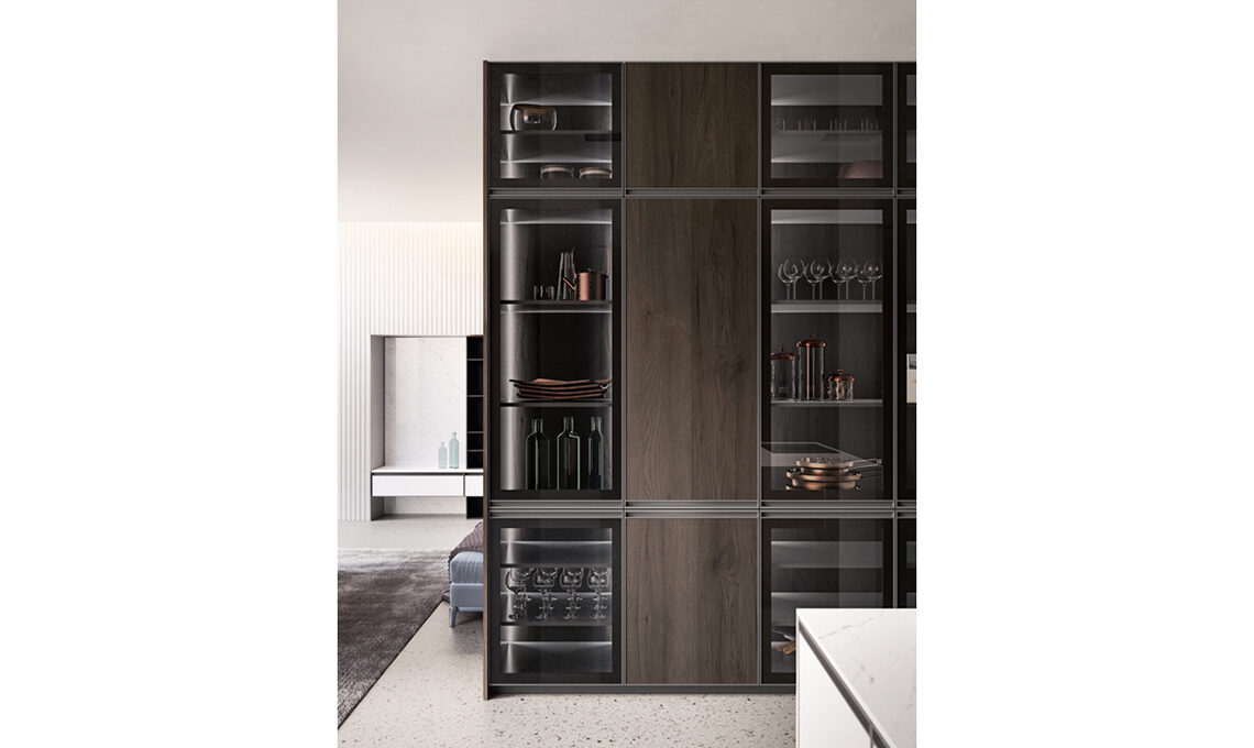 Kronos di Arredo3 con ante dal telaio in alluminio verniciato titanio a cui sono fissate lastre in vetro bianco opaco nelle basi e nell’isola e in impiallaciato rovere ebano in pensili e colonne; top e schienale in Laminam Statuarietto, bancone snack rovere ebano. Gli elettrodomestici