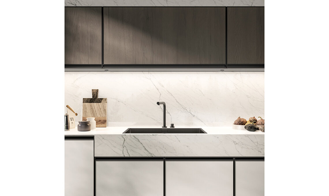‘Green’ possiamo quindi considerare l’alluminio, il vetro e anche il Laminam, un materiale super resistente e in lastre di basso spessore, che utilizza dal 20 al 40% di materie naturali riciclate pre-consumo e riesce a ricreare visivamente la texture di pietre e marmi.