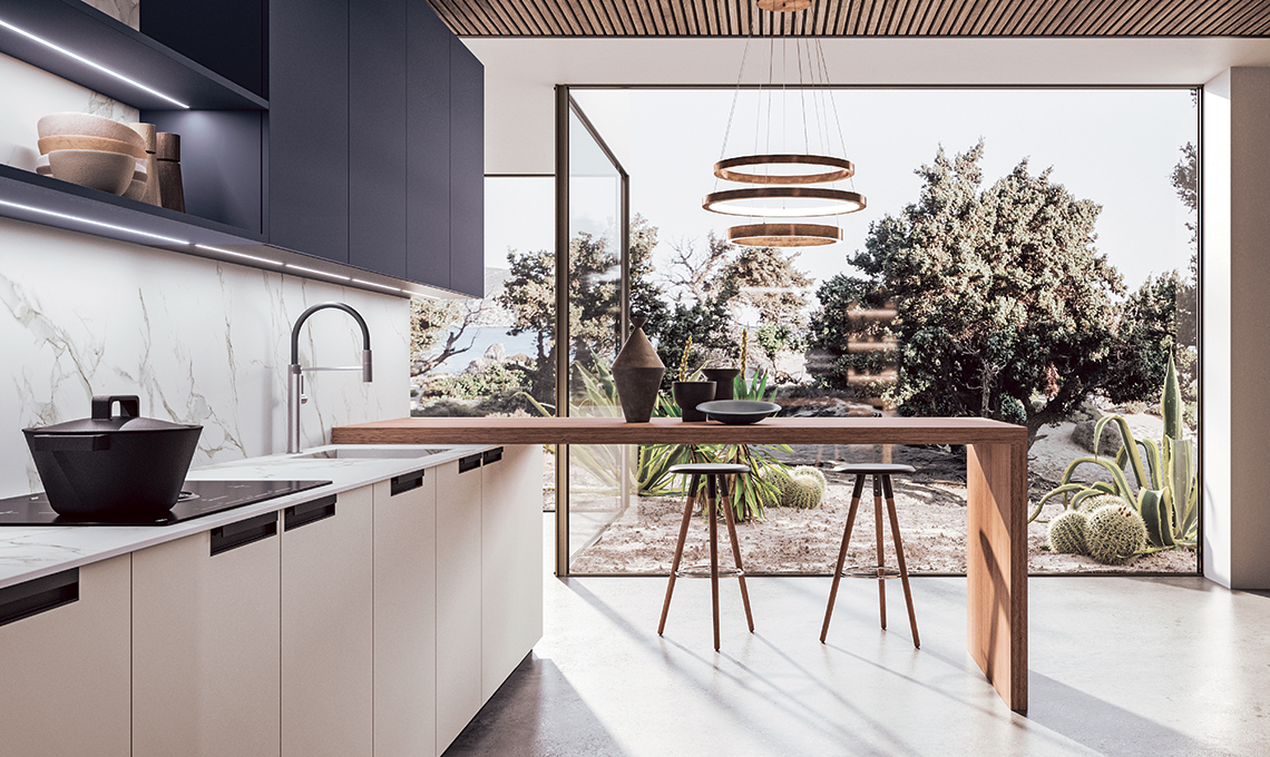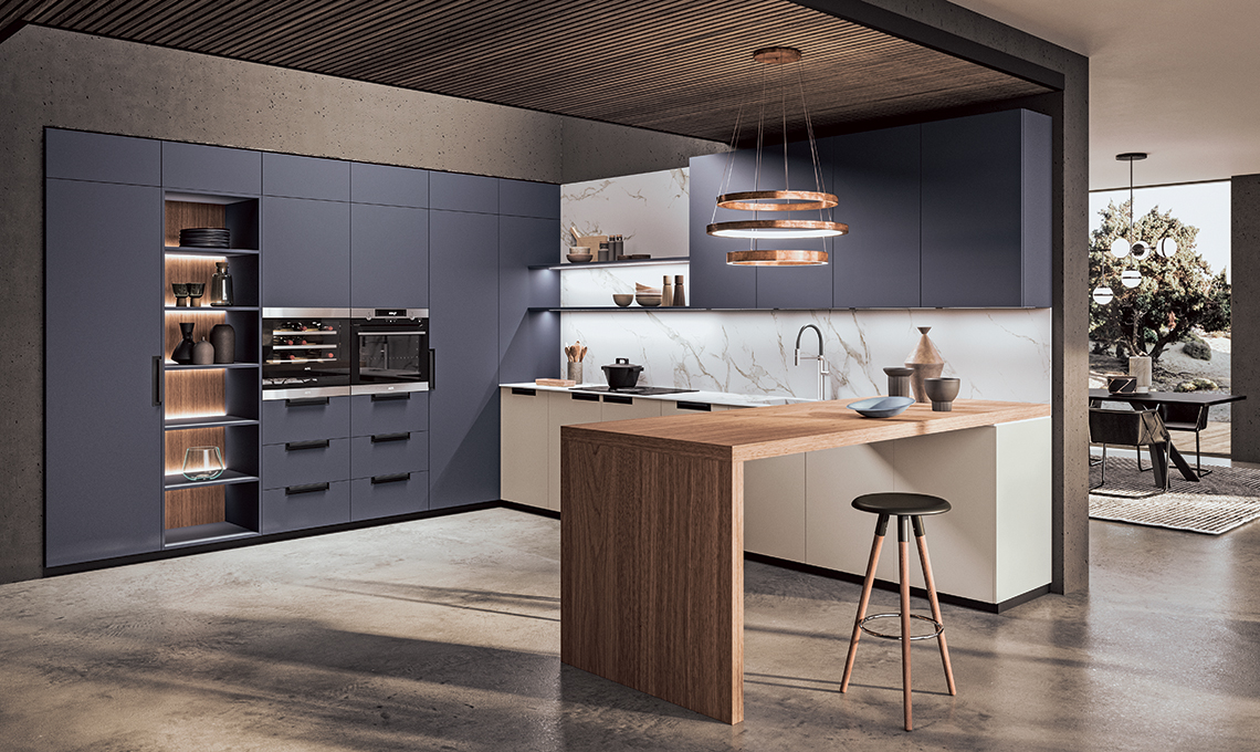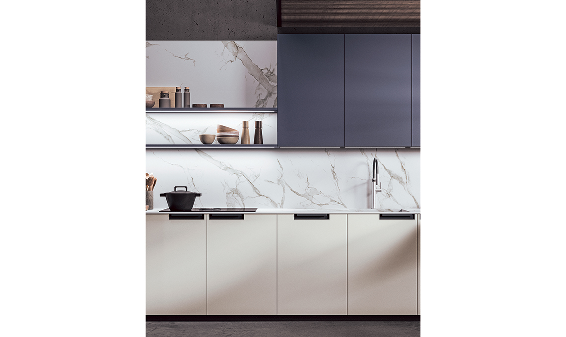 Devono essere resistenti (all’uso, all’umidità, al calore e alla luce), facili da tenere in forma senza detergenti particolari e con una texture che sia anche piacevole da toccare. Proprio come succede in questa versione di Petty Sound di Di Iorio, che combina un materiale green come il PET per le ante di colonne e pensili, il laccato di ultima generazione per le basi, l’HPL effetto marmo per la fascia paraspruzzi e l’impiallacciato Noce Canaletto per il banco snack: armonia e funzionalità perfette!