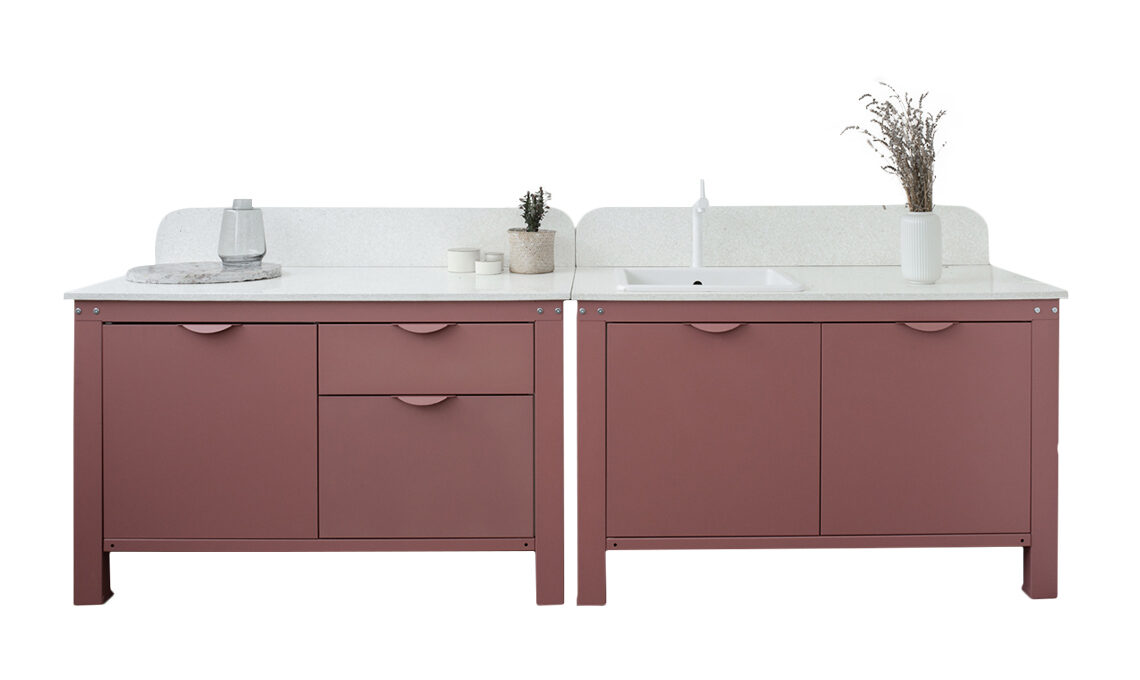 Nata con le strutture in acciaio verniciato a polvere, ora esiste anche in legno multistrato naturale o colorato, sempre completabili con svariati top ed elettrodomestici.