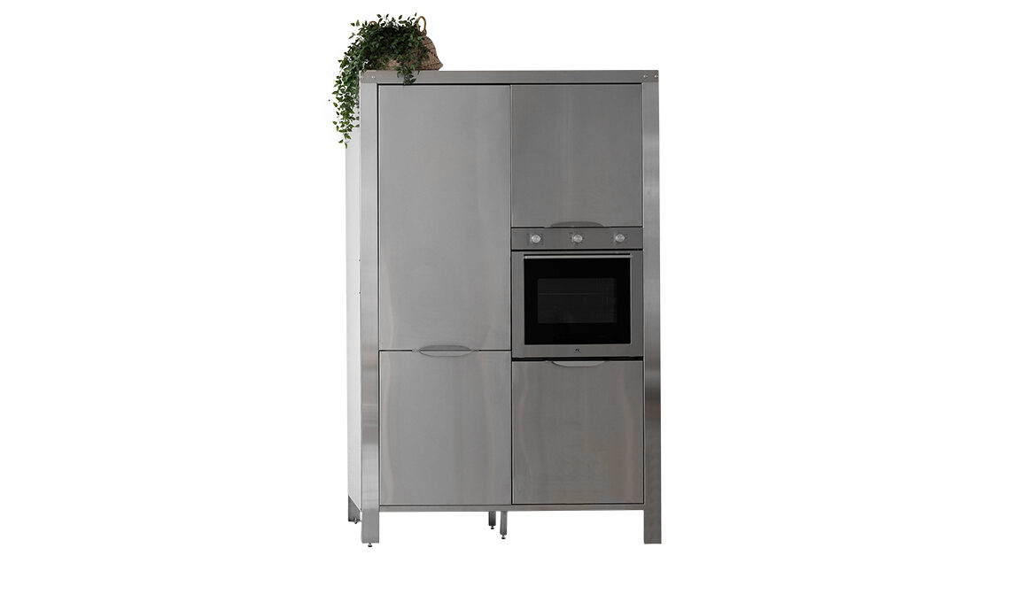 qui è in versione 100% acciaio inox con frigo, freezer e forno: l’ispirazione è quella delle cucine professionali e industrial.