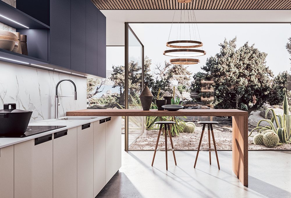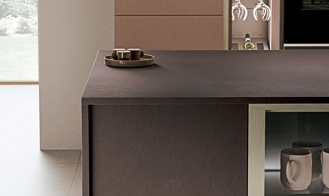 Total look: frontali, piano di lavoro e fianchi dell’isola sono realizzati con lo stesso materiale e con la medesima finitura.