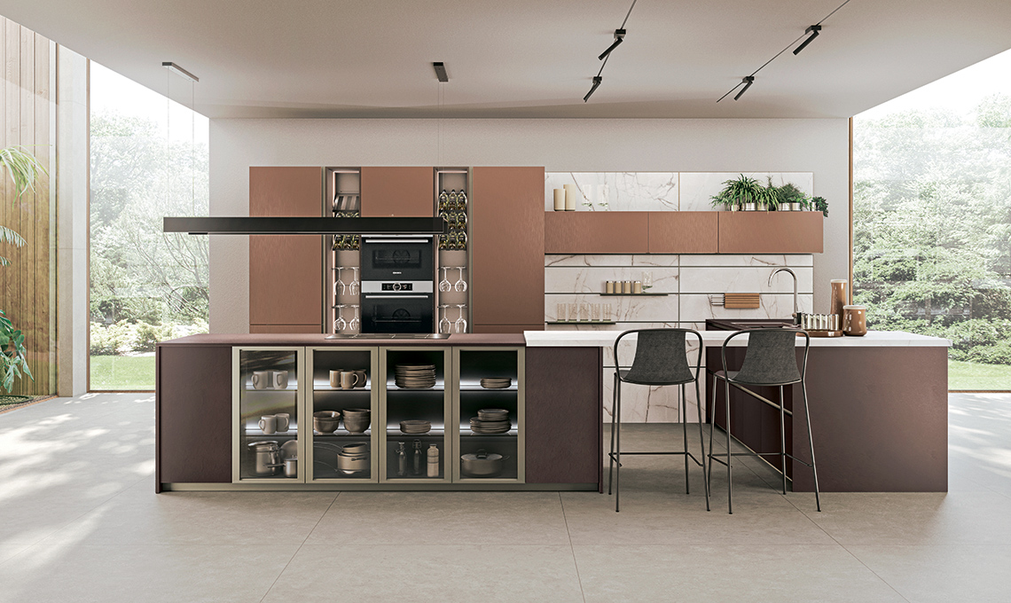 Immagina Mathera di Lube Cucine con ante e top Mathera Gipso Rosso, piano snack e boiserie in White Yule, ante di pensili e colonne in Marrone Ramato Opaco Spazzolato. Isola con ante in vetro Trasparente Fumé e telaio Titanio come gola e zoccolo.
