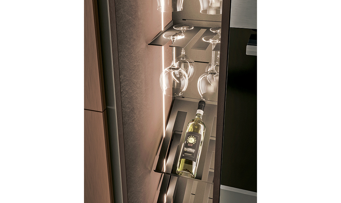 Le colonne con organizer per i calici hanno le ante in vetro trasparente e sono illuminate internamente con strisce a Led, pratiche ed eleganti.