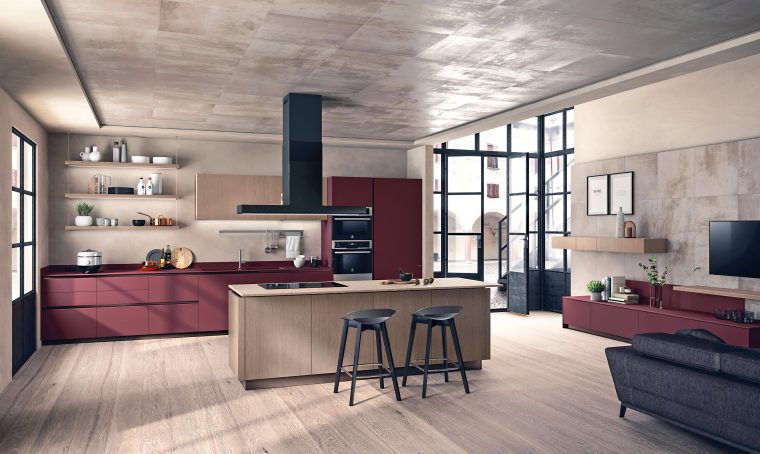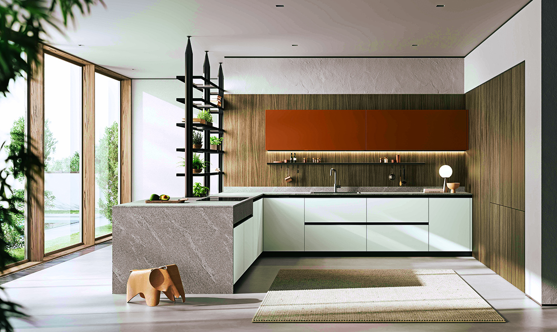 Origina di Febal Casa con anta profilo alluminio; basi con ante in laccato opaco bianco neve, colonne con ante Square in nobilitato Rovere Africano, pensili con ante Squa- re in laccato opaco Terracotta, top e fianchi in laminato Pietra Palladio Grigio. Sistema Lapis in Carbon Grey.