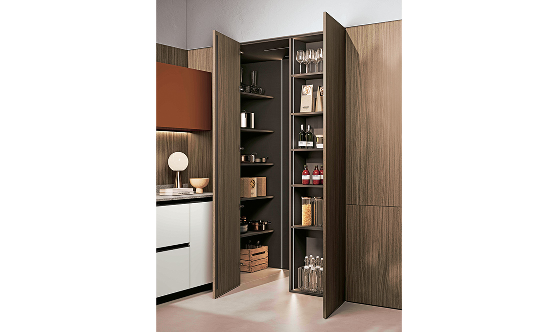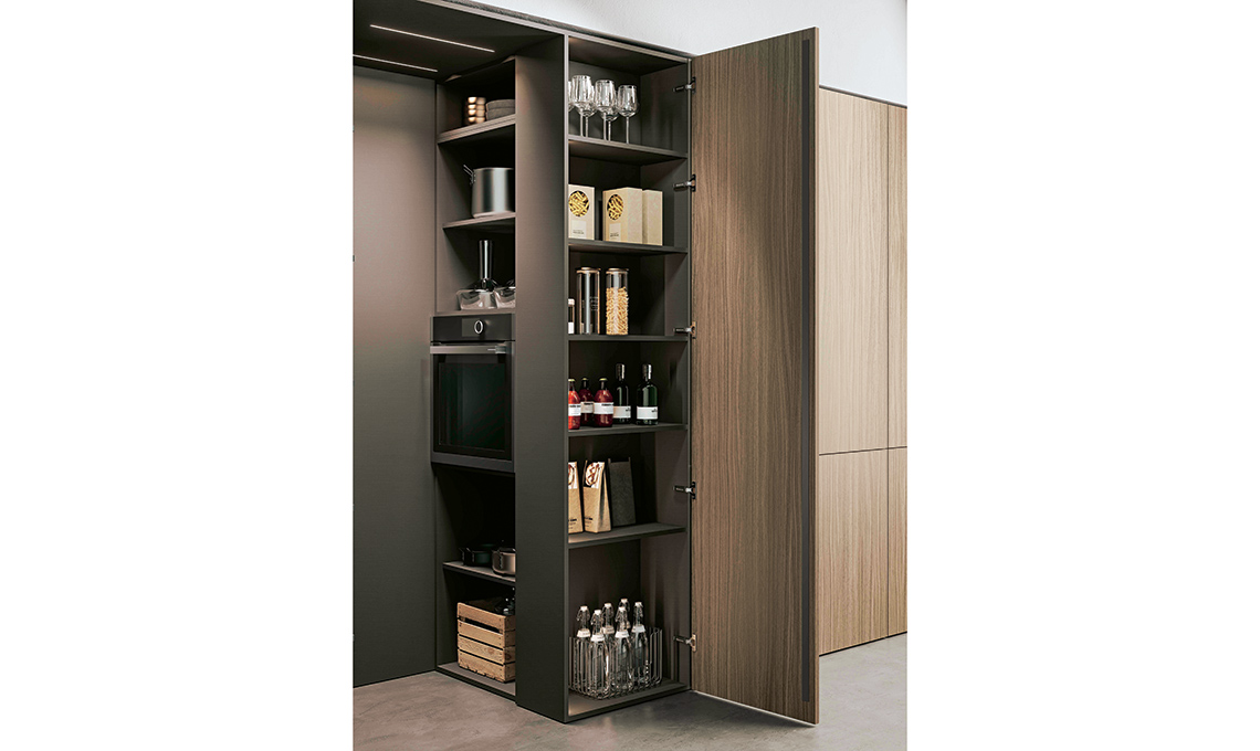 Nell’angolo c’è una cabina-ripostiglio con illuminazione interna, dotata di forno e mensole di diversa profondità su 3 lati, per organizzare una dispensa completa in poco più di 1 mq. Così tutto rimane in ordine e a portata di mano, nascosto dietro due ante.