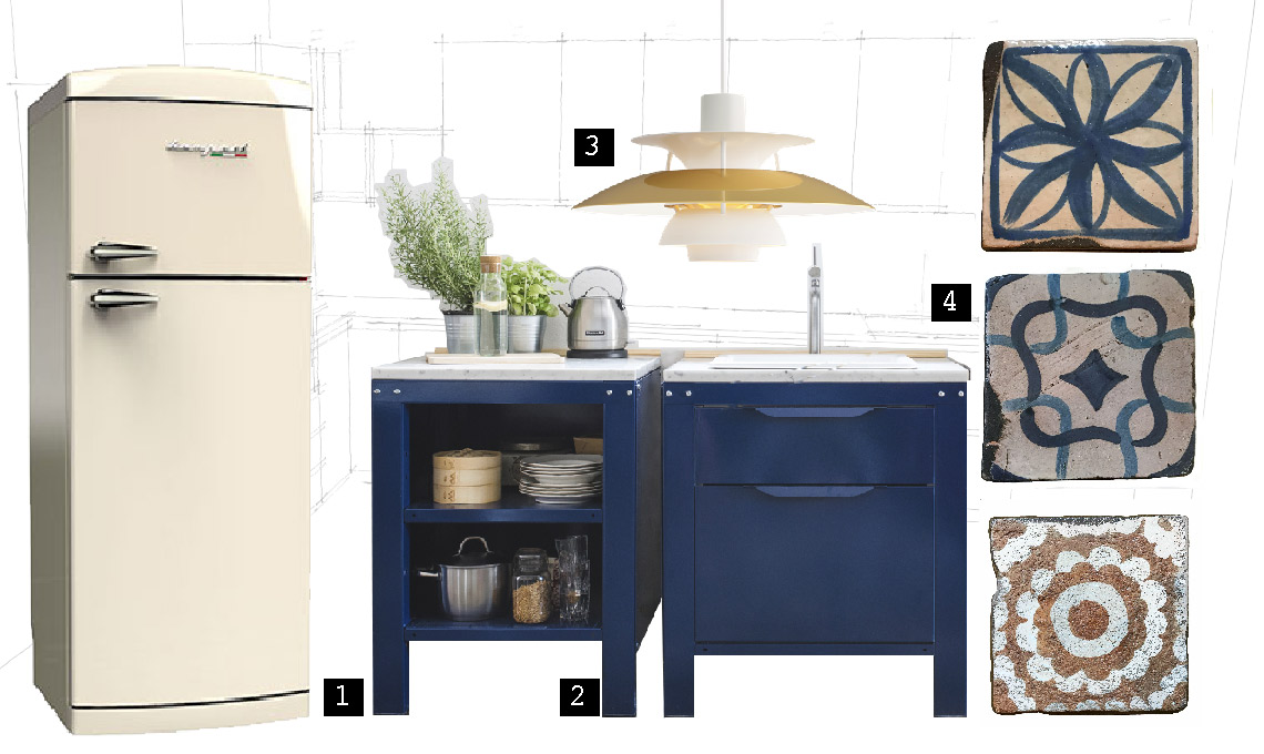 1 - Frigorifero doppia porta Retrò color crema [Bompani, prezzo su richiesta], 2 - Sistema cucina modulare in acciaio verniciato modulo M [Very Simple Kitchen, 80x88.2x65, prezzo su richiesta], 3 - lampadario a sospensione PH 5 Mini colore Ottone [Louis Poulsen, €550 ], 4 - Piastrelle in cotto smaltate e decorate a mano [Home Très Chic, da €13 a €38 al pezzo]