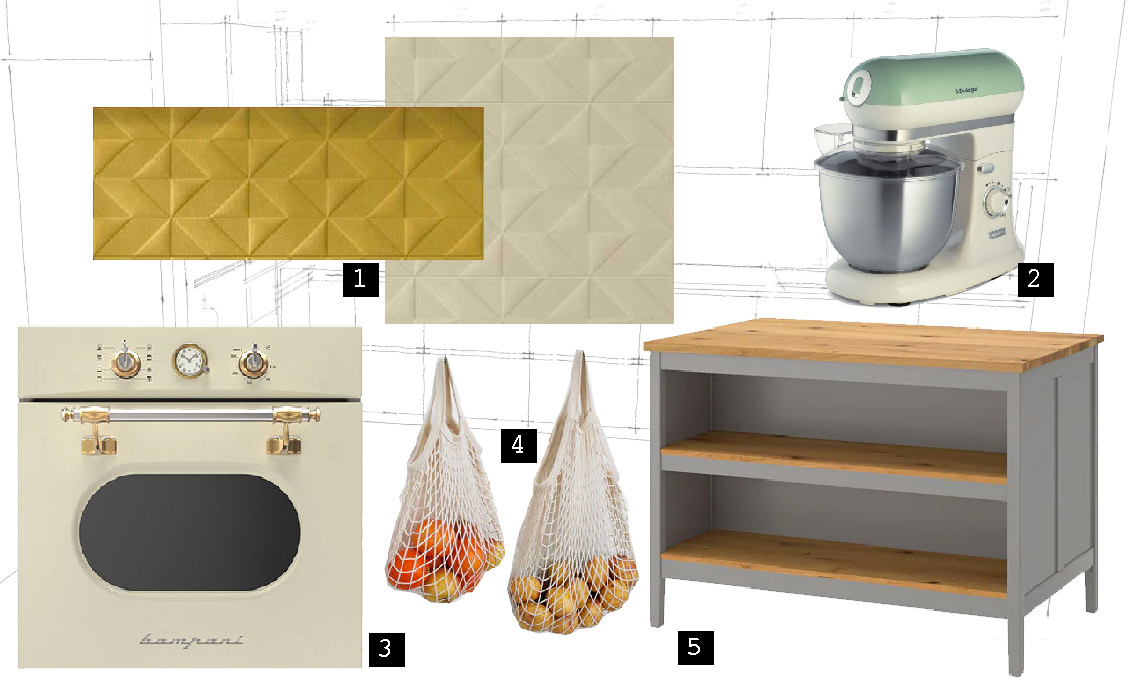 1 - Rivestimento in ceramica effetto trama tessile Outfit Ivory Struttura Tetris 3D e Outfit Ocher Struttura Tetris 3D [Marazzi, 25x76 cm, prezzo su richiesta], 2 - Impastatrice Vintage verde [Ariete, €150], 3 - Forno multifunzione estetica Retrò color crema [Bompani, €509], 4 - Set di 2 borse a rete naturale Kungsfors [Ikea, €5], 5 - Isola per cucina rovere verniciato grigio [Ikea, €299]
