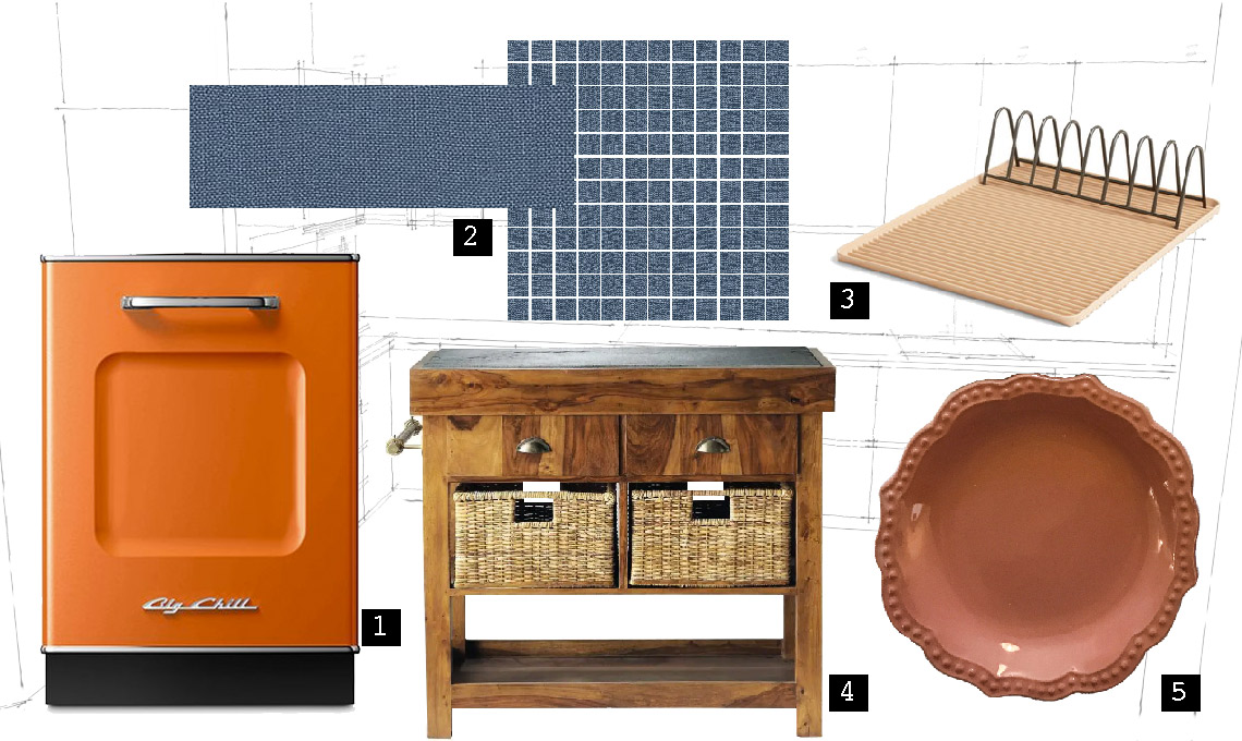 1 - Lavastoviglie Retro collection arancione [Big Chill, €1700 ], 2 - Rivestimento in ceramica effetto trama tessile Outfit Blue e Outfit Blue Mosaico [Marazzi, 25x76 cm e 30x30 cm, prezzo su richiesta], 3 - Scolapiatti Fish Drainer antracite [Hay, €29], 4 - Piano d'appoggio in massello di legno di sheesham e ardesia Lubèron [Maisons Du Monde, H85 x L95 x P46, €479], 5 - Serie piatti Mariposa in ceramica color rosa antico [Home Très Chic, €30]