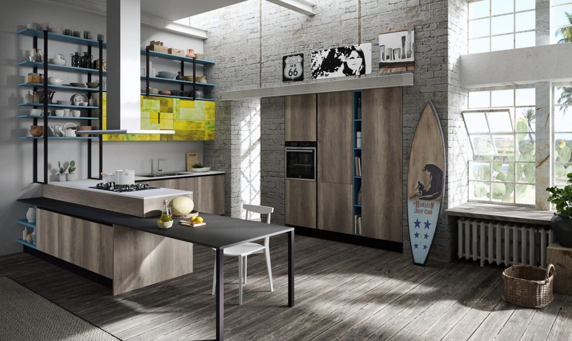 Superfici tecniche e materiche effetto legno danno vita a una cucina funzionale, pratica e facile da vivere e condividere in famiglia