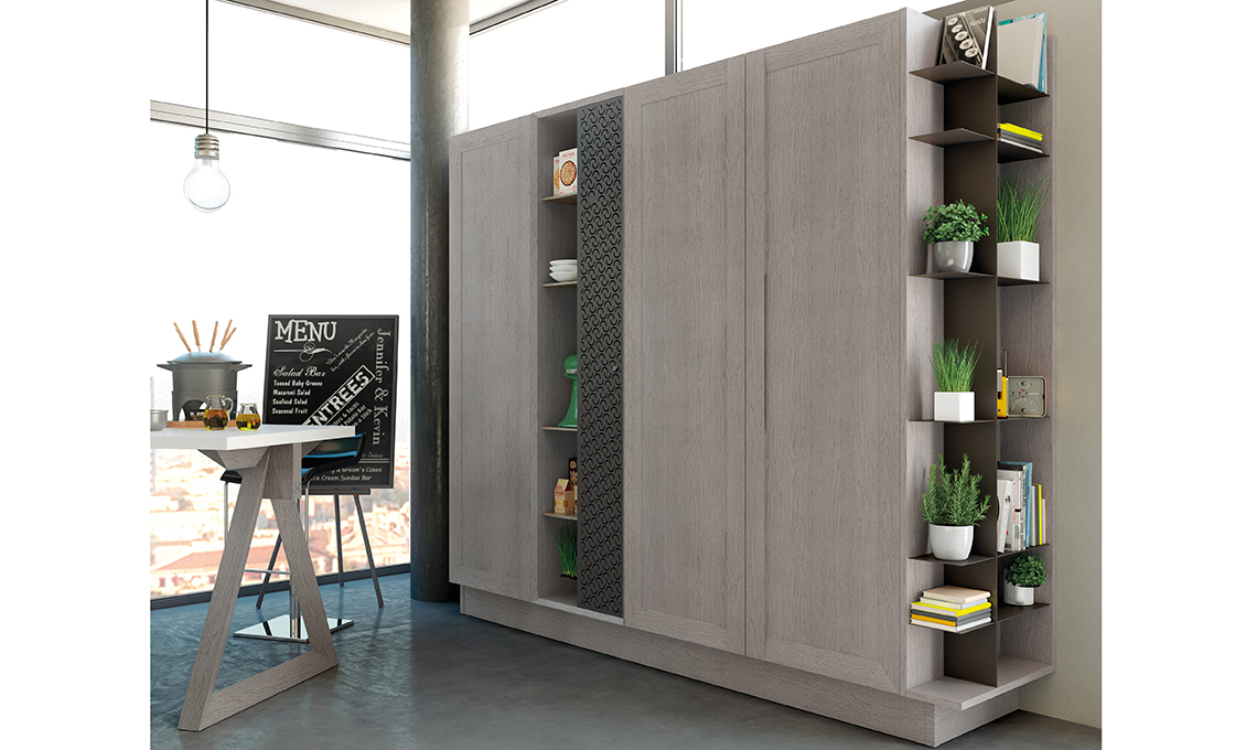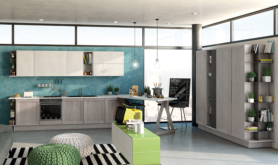 Con colonne attrezzate con vani a giorno multifunzione, pensili bassi e un bancone snack la cucina è perfetta per ricevere anche nel monolocale