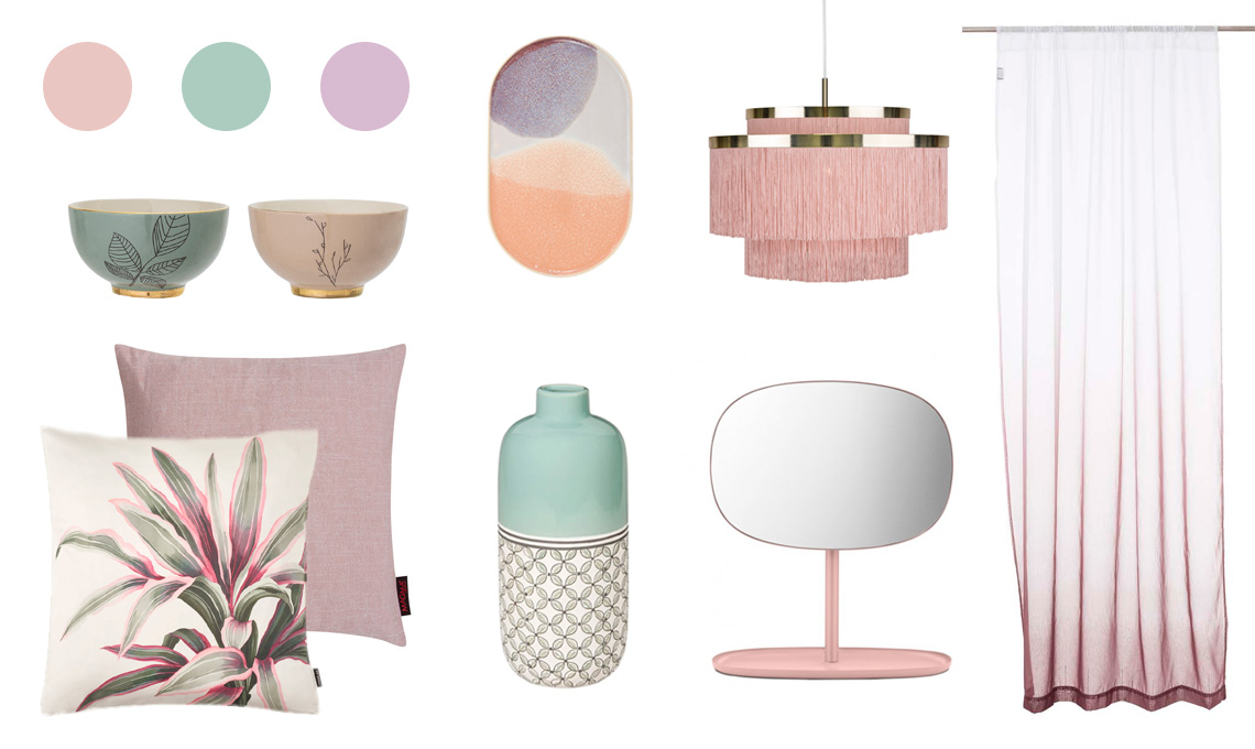 Tra i colori più gettonati, sicuramente vanno per la maggiore le tonalità pastello, come il rosa, il verde, il lilla e l’azzurro, perfettamente in armonia anche accostate tra loro. La mia moodboard verte molto sull’abbinamento del rosa, lilla e verde menta; armonici e delicati, questi colori doneranno luminosità anche quando saranno affiancati a tonalità più scure, come il grigio e il nero.
