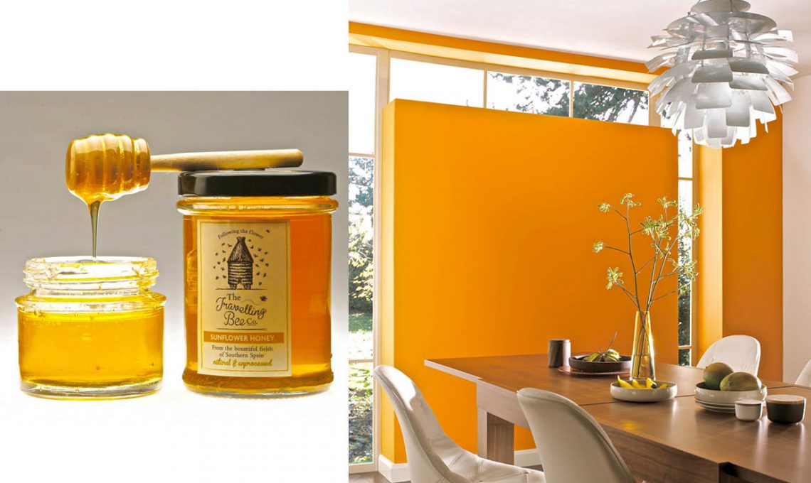 Calda atmosfera nei toni del miele con l’emulsione pittorica a base d’acqua Colour@Home Vinyl Silk Emulsion, col. colore Oranges; facile da applicare, setosa e ultra-opaca, [Wickes €16,30/2,5 litri].
