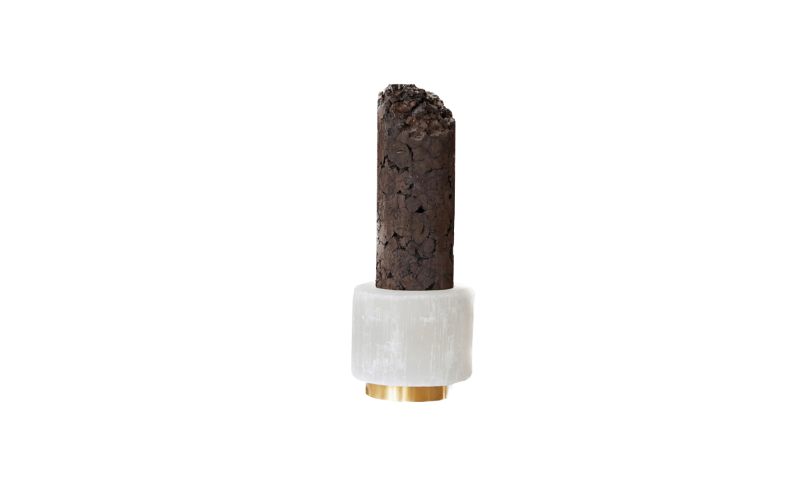 La Colonne Olfactive, in ottone e selenite, emana un aroma di verde e foresta dalla sommità in sughero [D’Orsay]