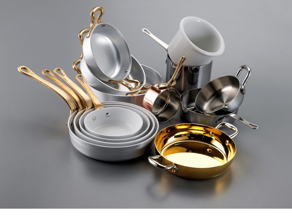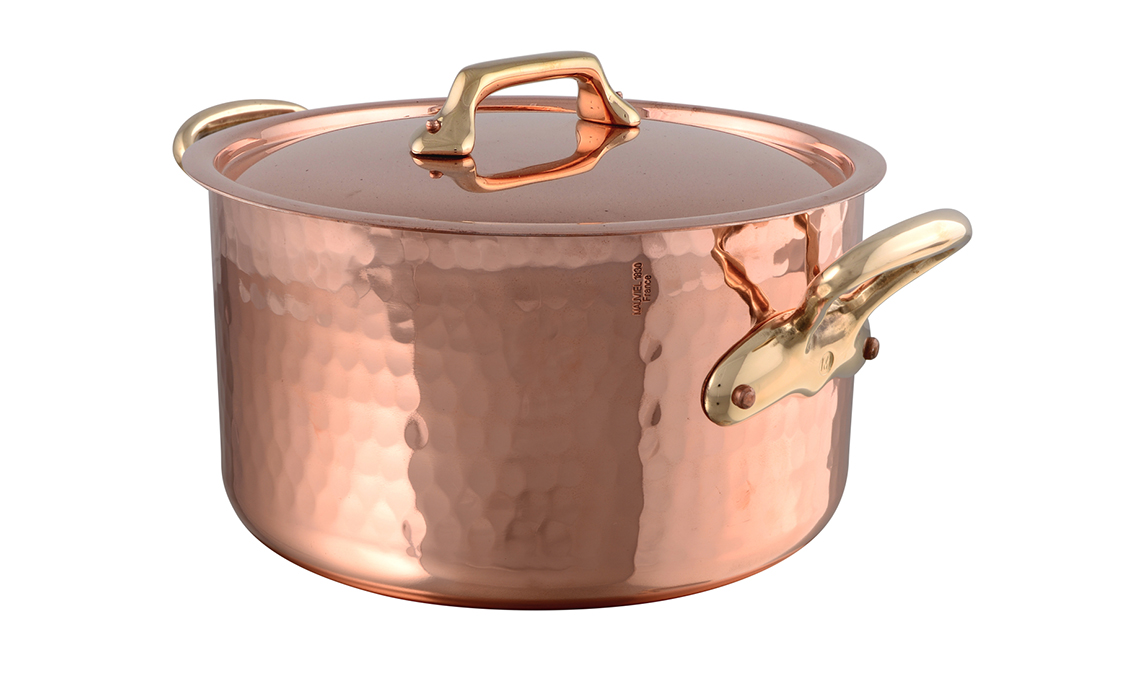 CASSERUOLA: ideale per la cottura del riso M’ Tradition è in rame stagnato e lucidato, con manici in bronzo [Mauviel 1830, Ø cm 24 €404,20].