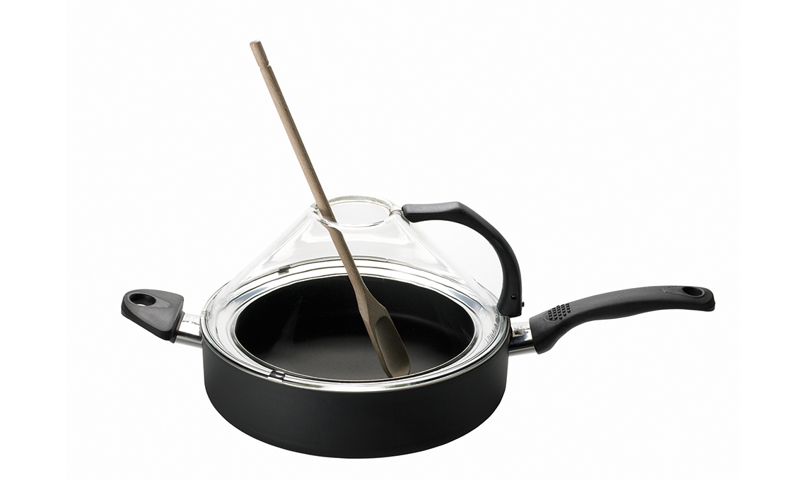 un coperchio in vetro con bocca superiore aperta. Per stufati e umidi, piatti dei quali è fondamentale conservare i giusti liquidi e aromi di cottura [Ballarini, Ø cm 28 €106,10].