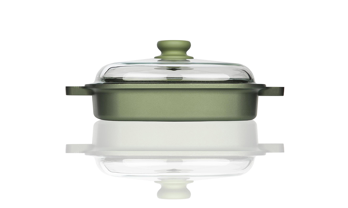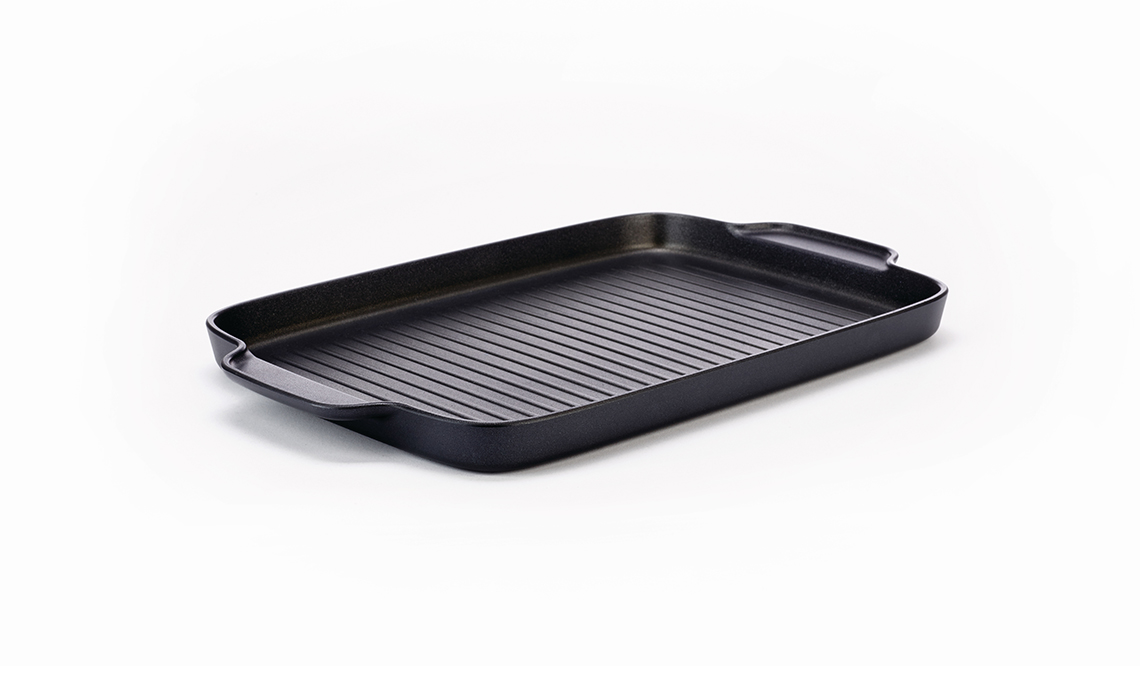 fondo in acciaio magnetico. Per carne e pesce senza grassi [Alessi, cm 38,4x23,6h €98].