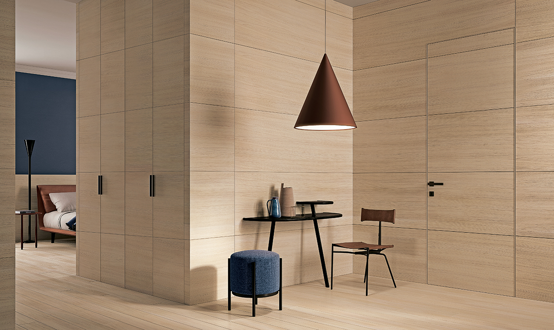 L’armadio Miria Gidea dotato di 4 ante filomuro Smooth modello Boise, si integra perfettamente con la boiserie e la porta Filomuro Boise, tutto in finitura Rovere Ice [Garofoli, cm 160x280h].