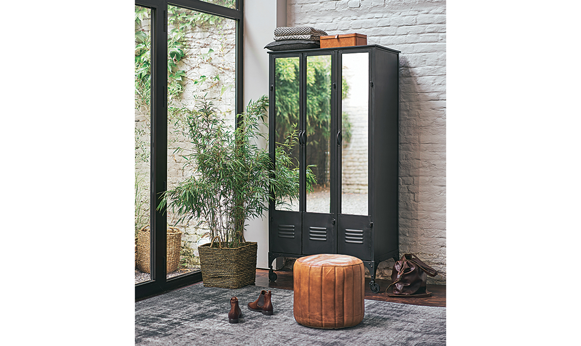 Compatto ma dotato di sei scomparti e di tubo appendiabiti, l’armadio Peter su ruote ha ante a specchio che consentono sia di darsi un ultimo sguardo prima di uscire, sia di ampliare lo spazio visivo [Maisons du Monde, cm 93x54x182h].
