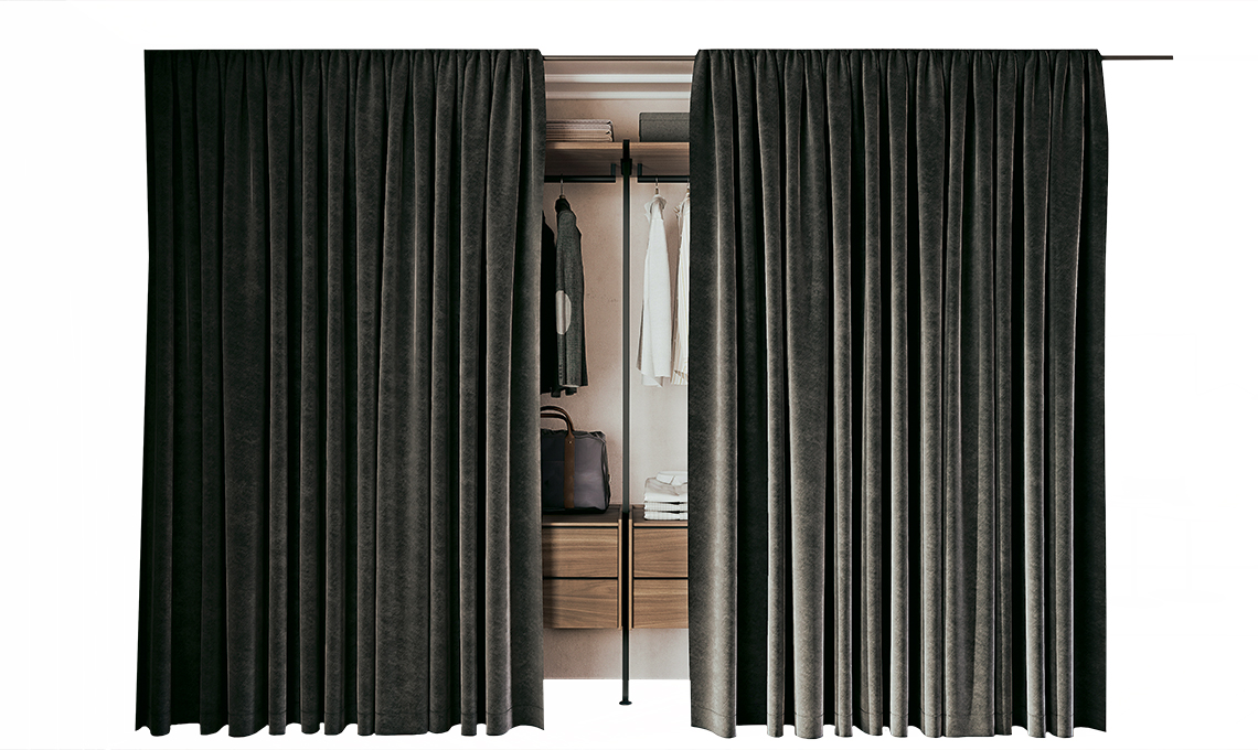 con diversi accessori, la cabina armadio Novel è chiusa dall’elegante tenda in poliestere Telon che, per dare continuità, può oscurare anche le finestre [MD House, cm 320x 65x256h ].