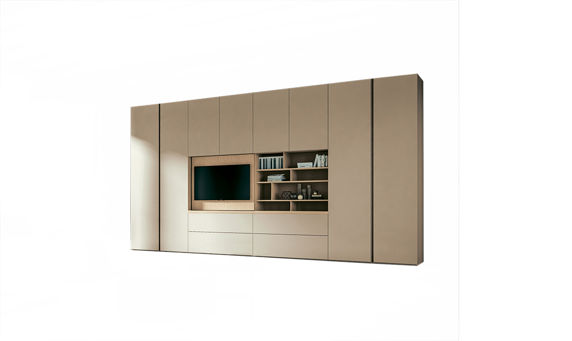 L’armadio battente laccato Opaco Biscotto ha una nicchia in essenza Rovere Naturale con vani a giorno e modulo tv: il pannello con meccanismo orientabile garantisce una visione ottimale [Tumidei, cm 433x59x261h].
